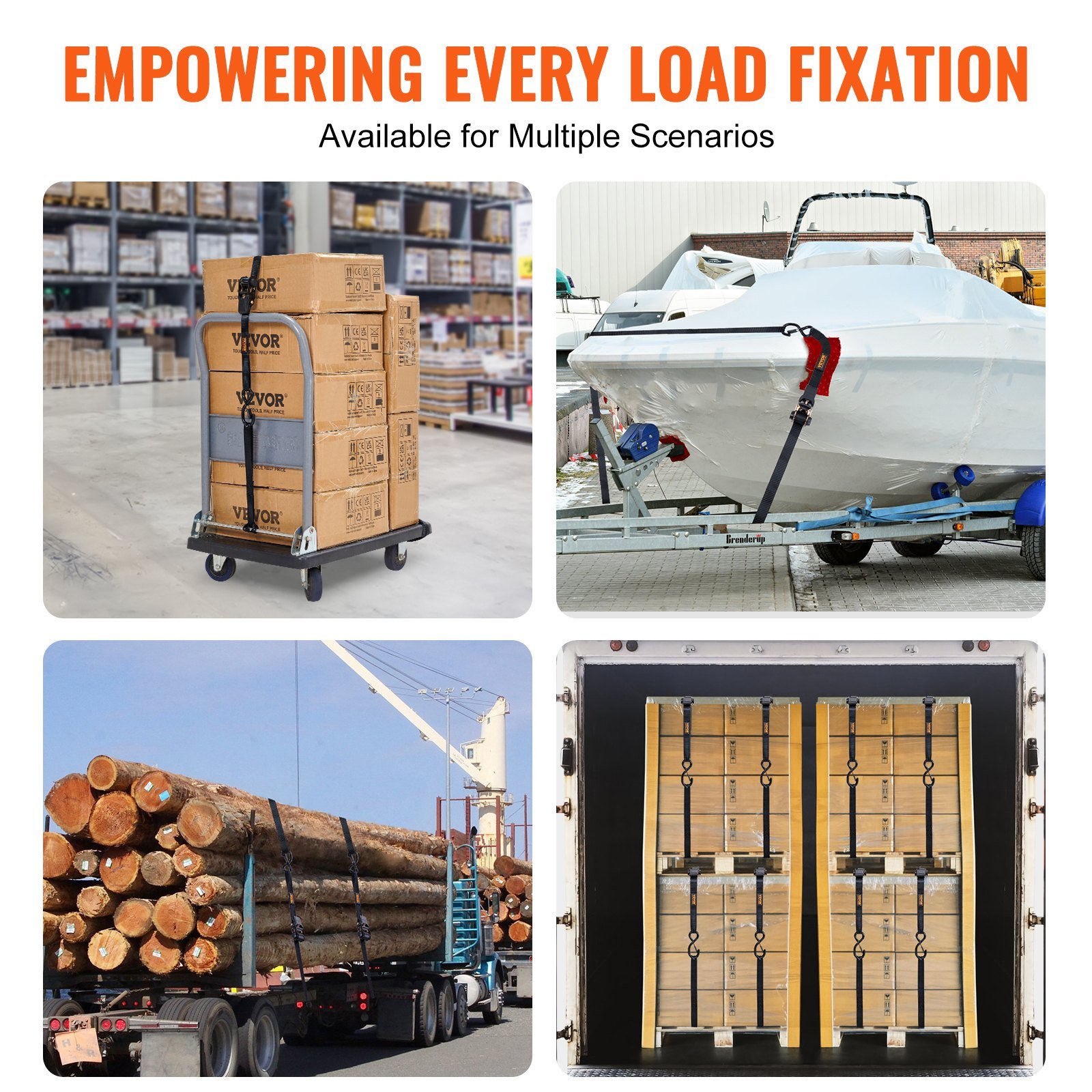 VEVOR ratchet straps provide durable and reliable security for transporting various small and large objects, including motorcycles, canoes, kayaks, ATVs, boxes, boats, furniture, lawn equipment, heavy machinery, and other cargo via truck beds, trailers, or roof racks.