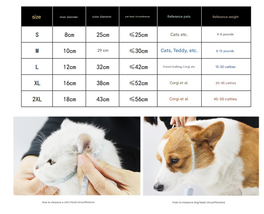 To ensure the best fit and effectiveness, please carefully measure your pet’s head circumference (around the widest part of the head in front of the ears) and compare it to the (Pet Head Circumference) in our sizing chart. Also, consider the inner and outer diameter for appropriate coverage. If your pet is between sizes, it’s often better to choose the slightly larger size for comfort, ensuring it’s still snug enough not to slip off.